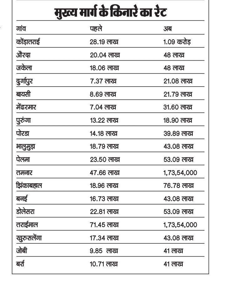 उदाहरण के तौर पर खरसिया के बर्रा क्षेत्र को देखिए—पहले यहां सड़क किनारे की जमीन की कीमत करीब 10.71 लाख रु/हेक्टेयर यानी लगभग 4.5 लाख रु/एकड़ लगती थी। मुआवजे में यह बढ़कर लगभग 40 लाख तक जाता था। लेकिन अब वही जमीन 41 लाख रु/हेक्टेयर यानी 17 लाख रु/एकड़ की हो गई है। नए नियम के हिसाब से अब मुआवजा 68 लाख रु/एकड़ तक पहुंच सकता है। यह गांव वालों के लिए बहुत बड़ी राहत है।