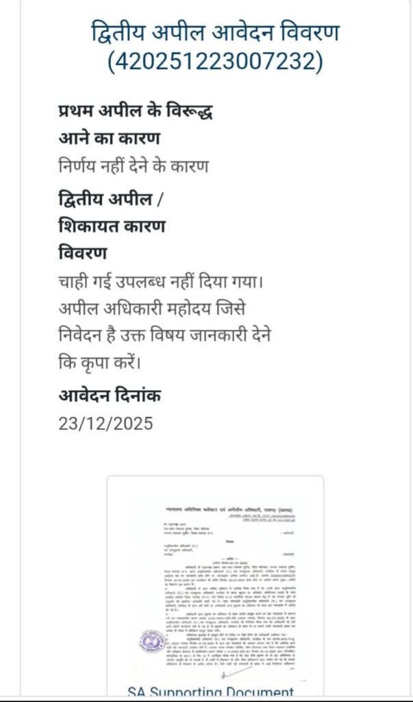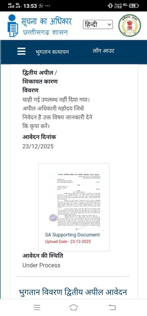 आज, 23 दिसंबर 2025 को आवेदक द्वारा छत्तीसगढ़ राज्य सूचना आयोग के समक्ष द्वितीय अपील विधिवत दायर कर दी गई है।