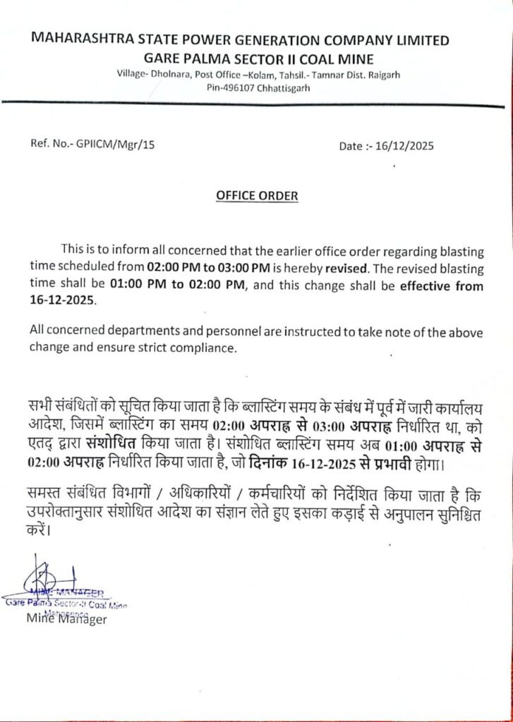 गारे पेलमा सेक्टर-II कोल माइंस को लेकर चल रहे घटनाक्रम के बीच कंपनी प्रबंधन ने ब्लास्टिंग समय में संशोधन कर एक महत्वपूर्ण कदम उठाया है। महाराष्ट्र स्टेट पावर जनरेशन कंपनी लिमिटेड (MSPGCL) द्वारा जारी कार्यालय आदेश के अनुसार अब ब्लास्टिंग का समय दोपहर 2 से 3 बजे के बजाय 1 से 2 बजे निर्धारित किया गया है, जो 16 दिसंबर 2025 से प्रभावी होगा।