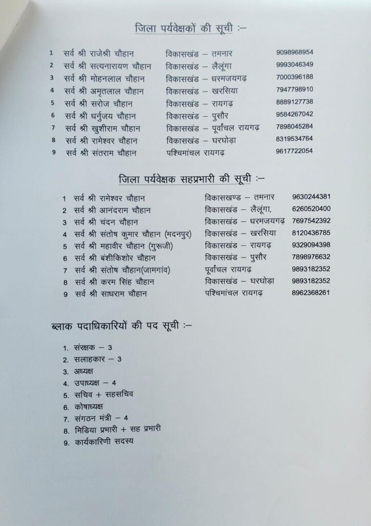 चौहान समाज जिला रायगढ़ कार्यालय द्वारा संगठन को जमीनी स्तर पर और अधिक सशक्त बनाने की दिशा में अहम निर्णय लिया गया है। जिले के समस्त विकासखंडों में समाज की इकाइयों को सक्रिय और व्यवस्थित करने के उद्देश्य से विकासखंड पदाधिकारियों, युवा मोर्चा तथा महिला मोर्चा के पदाधिकारियों के मनोनयन की प्रक्रिया 10 जनवरी 2026 तक पूर्ण करने का निर्णय लिया गया है।