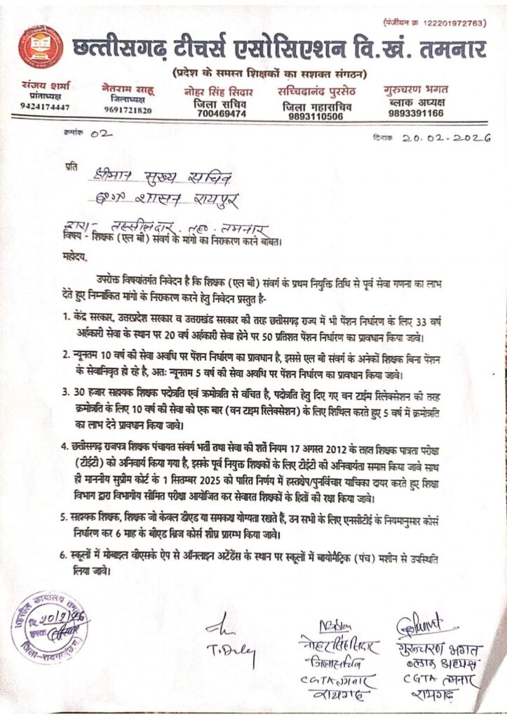 रायगढ़। प्रांतीय निर्देशानुसार छत्तीसगढ़ टीचर्स एसोसिएशन तमनार की ओर से कार्यालय तहसीलदार तमनार श्रीमती ऋचा सिंह के माध्यम से प्रदेश के माननीय मुख्यमंत्री, शिक्षा मंत्री, मुख्य सचिव, शिक्षा सचिव तथा संचालक लोक शिक्षण संचालनालय के नाम से टेट, पदोन्नति, प्रथम नियुक्ति की तिथि से सेवा गणना करते हुए क्रमोन्नति, पुरानी पेंशन की गणना सहित मांगों को लेकर दिनांक 20.02.2026 को ज्ञापन सौंपा गया।