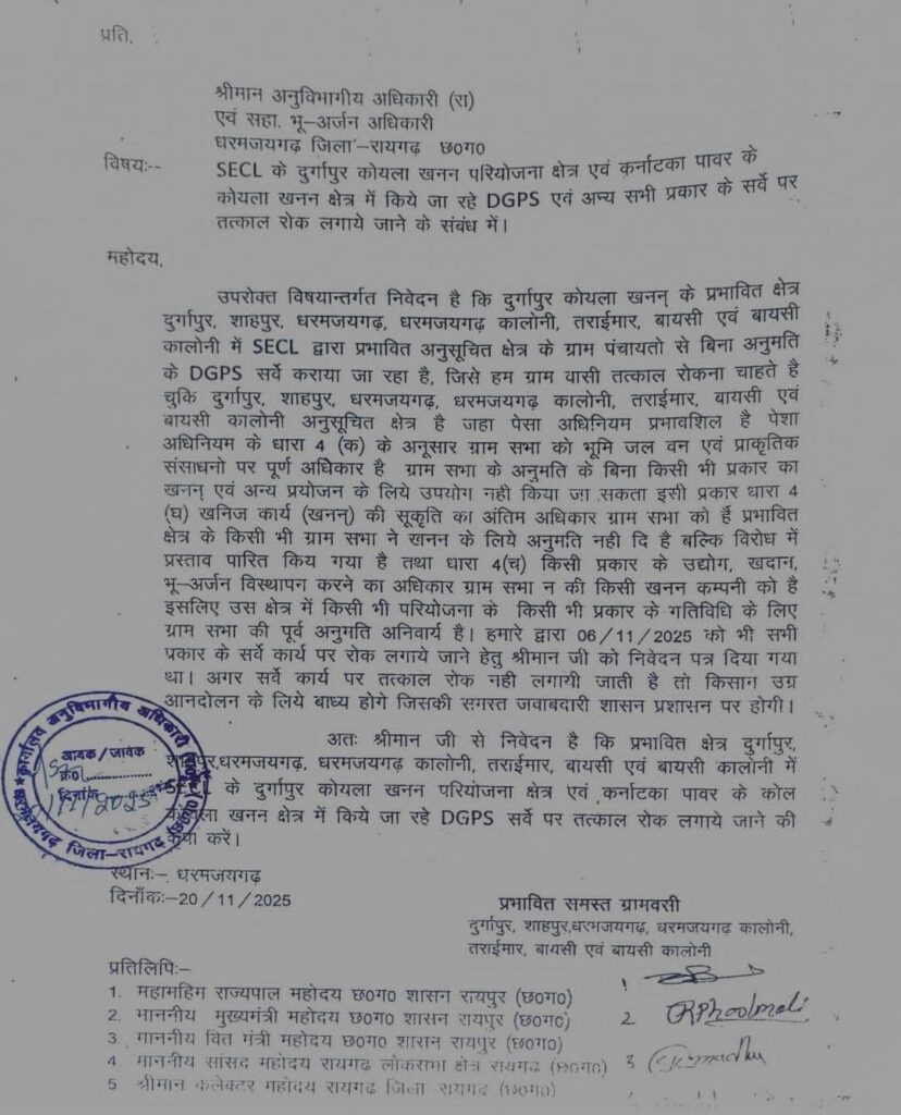 दुर्गापुर, शाहपुर, धरमजयगढ़, तराईमार, बायसी और कॉलोनी क्षेत्रों के सैकड़ों ग्रामीण एसडीएम कार्यालय पहुंचे, जहां उन्होंने बिना ग्रामसभा की अनुमति चल रहे सर्वेक्षण को असंवैधानिक बताते हुए तत्काल रोक की मांग की।