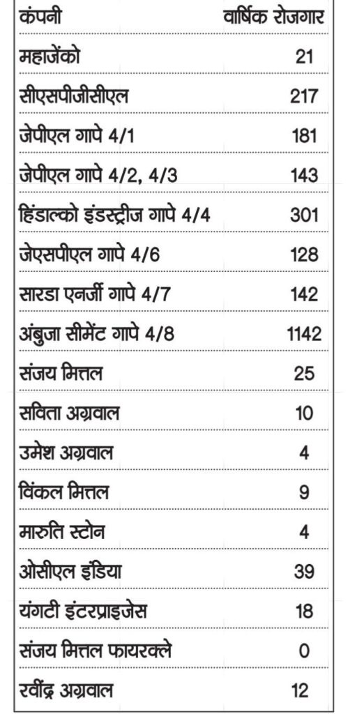 उदाहरण के तौर पर, महाराष्ट्र स्टेट पावर जेनरेशन कंपनी ने 14 गांवों की जमीन अधिग्रहित की, लेकिन रोजगार केवल 21 लोगों को मिला। वहीं छत्तीसगढ़ स्टेट पावर जेनरेशन कंपनी ने सालाना औसतन 217 युवाओं को काम देने की जानकारी दी, जबकि प्रभावित परिवारों की संख्या लगभग 1000 बताई जाती है। इसी तरह जेपीएल की गारे पेलमा 4/1 खदान में 181 युवाओं को रोजगार दिया गया, लेकिन यह संख्या भी स्थायी नौकरी नहीं, बल्कि कुछ महीनों के अस्थायी काम तक सीमित रही।