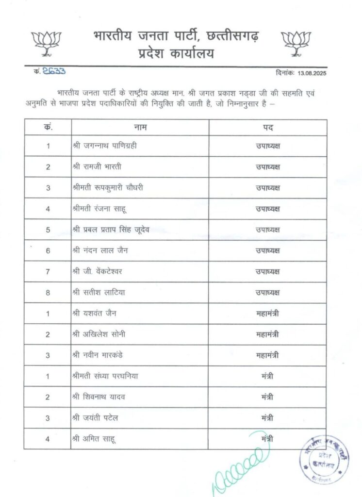 भाजपा छत्तीसगढ़ के प्रदेश पदाधिकारियों की हुई घोषणा