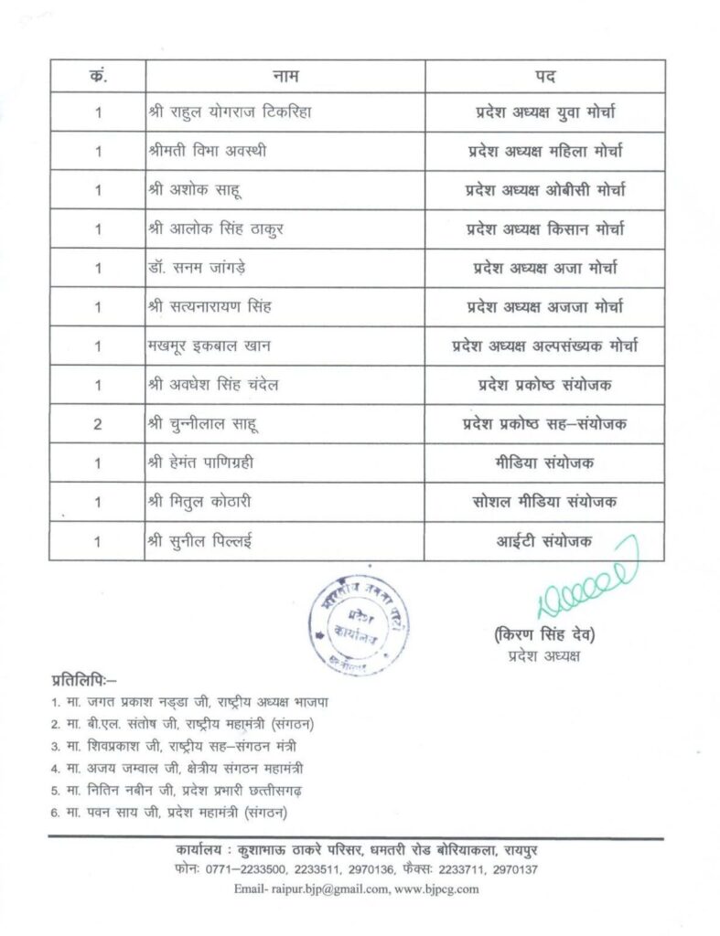 भाजपा राष्ट्रीय अध्यक्ष जेपी नड्डा की सहमति से भाजपा प्रदेश अध्यक्ष किरण सिंह देव ने भाजपा छत्तीसगढ़ के प्रदेश पदाधिकारियों की घोषणा की..