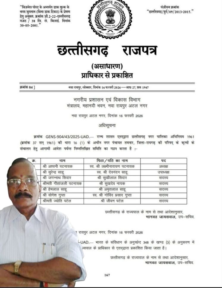 छत्तीसगढ़ शासन के नगरीय प्रशासन एवं विकास विभाग ने तमनार को प्रशासनिक रूप से सशक्त बनाने की दिशा में महत्वपूर्ण कदम उठाते हुए नगर पंचायत तमनार की सात सदस्यीय समिति का गठन कर दिया है। यह निर्णय राजपत्र में प्रकाशित अधिसूचना के माध्यम से प्रभावी हुआ, जिसके साथ ही तमनार में नगरीय शासन का नया अध्याय आरंभ हो गया है।