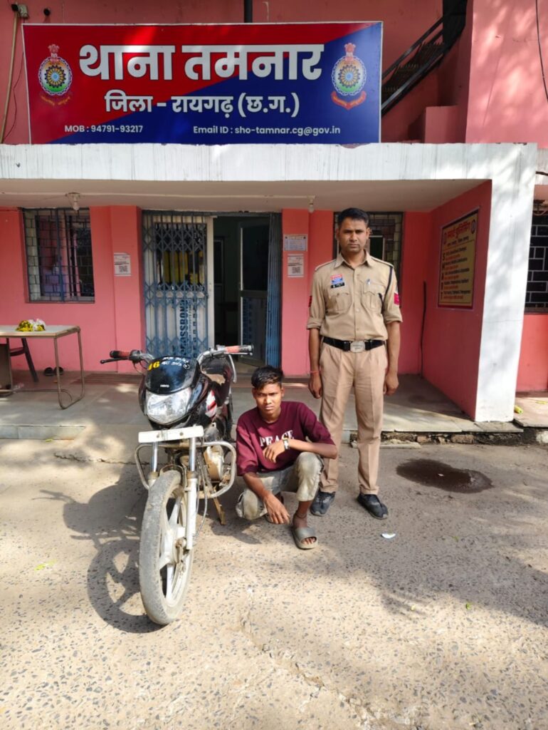 रायगढ़। जिले के तमनार थाना क्षेत्र में मोटरसाइकिल चोरी के एक मामले का पुलिस ने त्वरित खुलासा करते हुए आरोपी को गिरफ्तार कर लिया है। इस कार्रवाई ने एक बार फिर यह साबित किया है कि पुलिस की सक्रियता और मुखबिर तंत्र की सजगता अपराधियों के लिए लगातार चुनौती बनी हुई है।