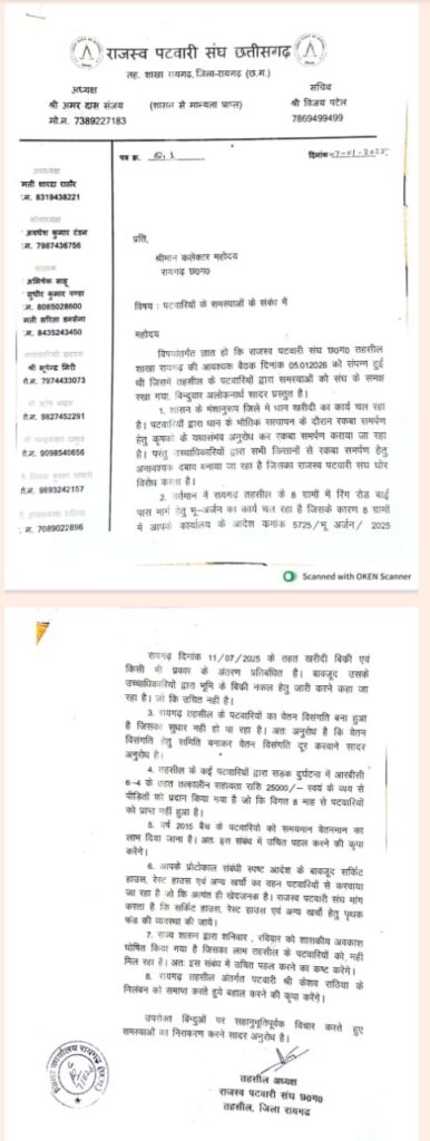 धान खरीदी के बीच जिले में राजस्व अमले और प्रशासन के बीच तनाव खुलकर सामने आ गया है। किसानों से जबरन रकबा समर्पण कराकर धान खरीदी कम करने के आरोपों को लेकर राजस्व पटवारी संघ ने कलेक्टर के नाम शिकायती ज्ञापन सौंपा है। ज्ञापन में न केवल किसानों पर बनाए जा रहे कथित दबाव का जिक्र है, बल्कि अफसरों द्वारा पटवारियों से नियम विरुद्ध काम कराने, यहां तक कि वीआईपी प्रोटोकॉल का खर्च खुद उठाने जैसे गंभीर आरोप भी लगाए गए हैं।