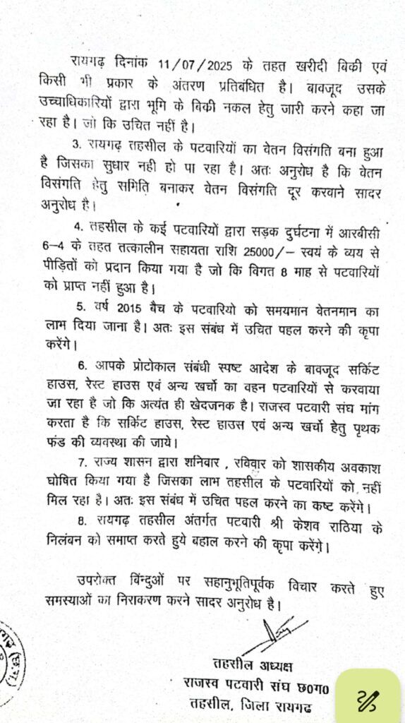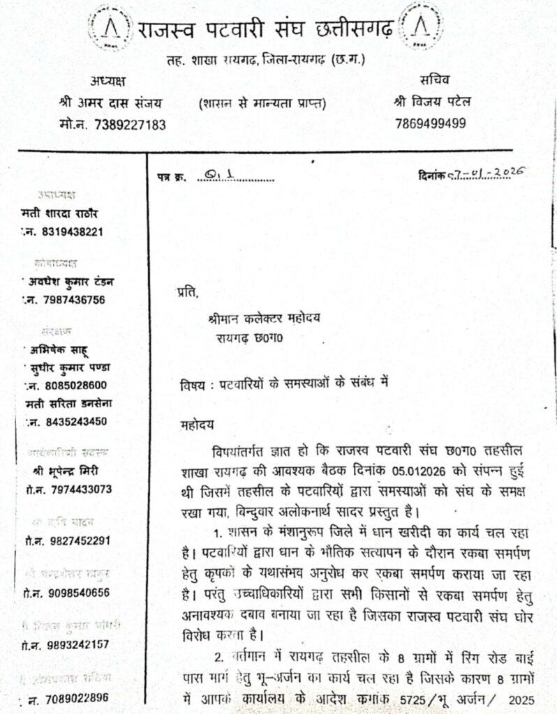 रायगढ़ जिले में राजस्व व्यवस्था की नींव माने जाने वाले पटवारियों का धैर्य अब जवाब देने लगा है। पटवारी संघ छत्तीसगढ़, तहसील रायगढ़ के बैनर तले सामने आए आरोपों ने जिला प्रशासन की कार्यप्रणाली पर गंभीर सवाल खड़े कर दिए हैं। संघ का साफ कहना है कि शासन के निर्देशों के विपरीत पटवारियों पर लगातार असंगत और अनुचित दबाव बनाया जा रहा है, जिससे न केवल उनका कामकाज प्रभावित हो रहा है, बल्कि उनकी सामाजिक और पेशेवर छवि भी दांव पर लग रही है।