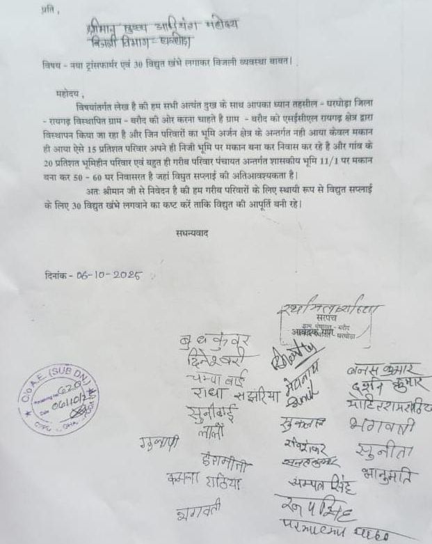 सोमवार को ग्राम के ग्रामीणों ने सरपंच प्रतिनिधि संतकुमार राठिया के नेतृत्व में विद्युत विभाग घरघोड़ा का रुख किया और विभाग के मुख्य अभियंता को ज्ञापन सौंपा। ज्ञापन में ग्रामीणों ने मांग की कि विस्थापित परिवारों और राजस्व भूमि पर निवासरत गरीब परिवारों को तत्काल बिजली कनेक्शन और नया ट्रांसफार्मर उपलब्ध करवाया जाए। उनका कहना है कि एसईसीएल द्वारा विस्थापन की प्रक्रिया में कई परिवारों की उपेक्षा की गई है, जिससे अब उनका जीवन संकट में है।