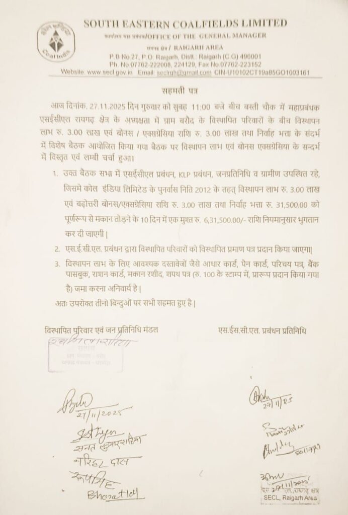 बरौद गांव के विस्थापन को लेकर महीनों से चली खींचतान, जवाबदेही और बार–बार की बैठकों का सिलसिला आखिरकार गुरुवार, 27 नवंबर की सुबह एक निर्णायक मुकाम पर आकर थम गया। गांव के बीचोंबीच बने बस्ती चौक में आयोजित विशेष बैठक में एसईसीएल रायगढ़ क्षेत्र के महाप्रबंधक की अध्यक्षता में वह सहमति बनी, जिसका ग्रामीण कई महीनों से इंतजार कर रहे थे।