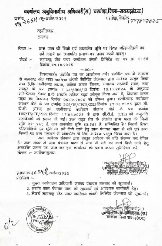 नवीन आदेश में घरघोड़ा एसडीएम ने तमनार तहसीलदार को पाता ग्राम पंचायत से सर्वे हेतु एनओसी प्राप्त करने का निर्देश दिया है। सर्वे शुरू करने से पहले पंचायत की अनुमति अनिवार्य कर दी गई है। प्रशासन का दावा है कि इस प्रक्रिया से गांवों में पारदर्शिता बनी रहेगी और विवाद कम होंगे।