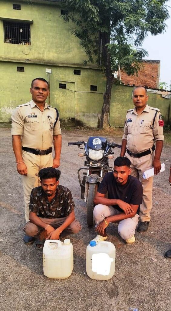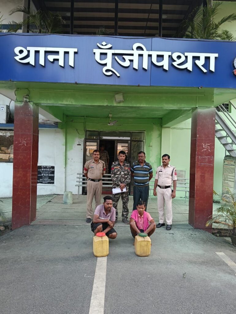 🛑 पूंजीपथरा पुलिस की दोहरी छापेमारी – 27 लीटर महुआ शराब बरामद