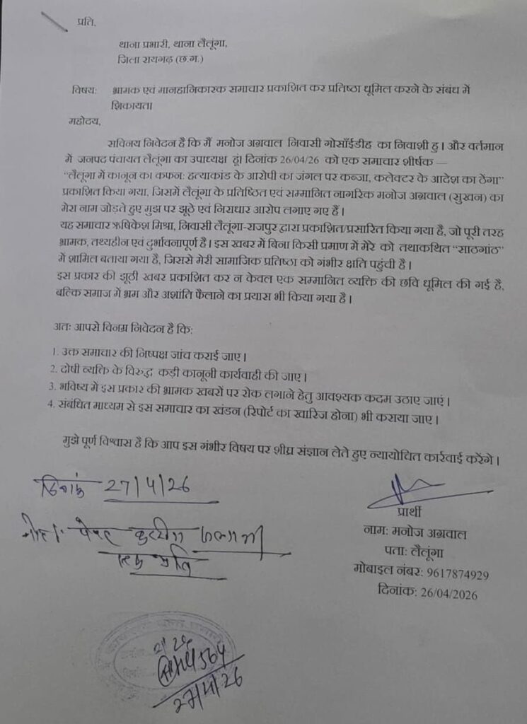 बताया जा रहा है कि 26 अप्रैल को प्रकाशित एक खबर में जनपद पंचायत लैलूंगा के उपाध्यक्ष मनोज अग्रवाल का नाम कथित रूप से एक विवादित संदर्भ में जोड़ा गया। इसके बाद उपाध्यक्ष ने इस पर आपत्ति दर्ज कराते हुए थाना लैलूंगा में लिखित शिकायत दी है। उनका कहना है कि खबर में लगाए गए आरोप तथ्यों पर आधारित नहीं हैं और इससे उनकी छवि प्रभावित हुई है। उन्होंने निष्पक्ष जांच और आवश्यक कानूनी कार्रवाई की मांग की है।