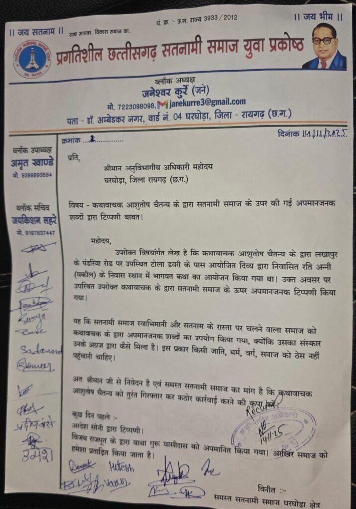 सतनामी समाज के सम्मान और आस्था पर चोट करने वाले कथित बयान ने पूरे क्षेत्र की सामाजिक शांति को झकझोर दिया है। शुक्रवार को प्रगतिशील छत्तीसगढ़ सतनामी समाज युवा प्रकोष्ठ, घरघोड़ा ने दो चरणों में—थाना प्रभारी घरघोड़ा और SDM घरघोड़ा—को अलग-अलग ज्ञापन सौंप कर कथावाचक आशुतोष चैतन्य के विरुद्ध कठोर कार्रवाई की मांग की।