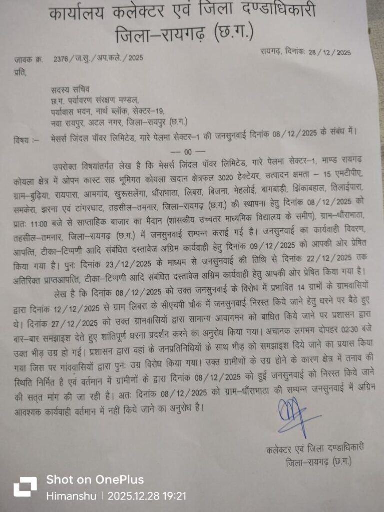 प्रशासनिक सूत्रों के अनुसार गारे पेलमा सेक्टर–1 परियोजना को लेकर 08 दिसंबर 2025 को धौराभाठा में प्रस्तावित जनसुनवाई को जल्द निरस्त किए जाने की संभावना है। हालांकि इस संबंध में अब तक कोई औपचारिक लिखित आदेश सार्वजनिक नहीं किया गया है, लेकिन प्रशासनिक स्तर पर आवश्यक प्रक्रिया की जानकारी निकल कर सामने आ रही है।